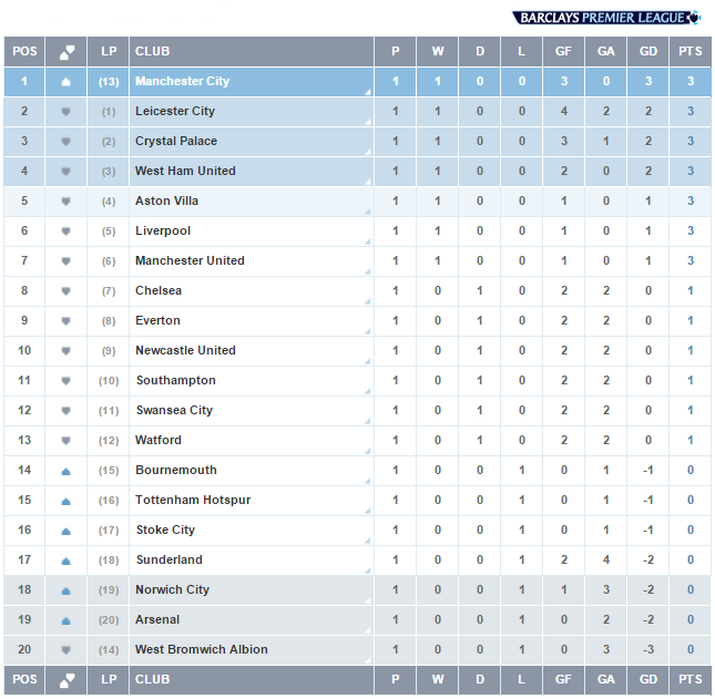 EPL STANDINGS AFTER ONE MATCH EACH